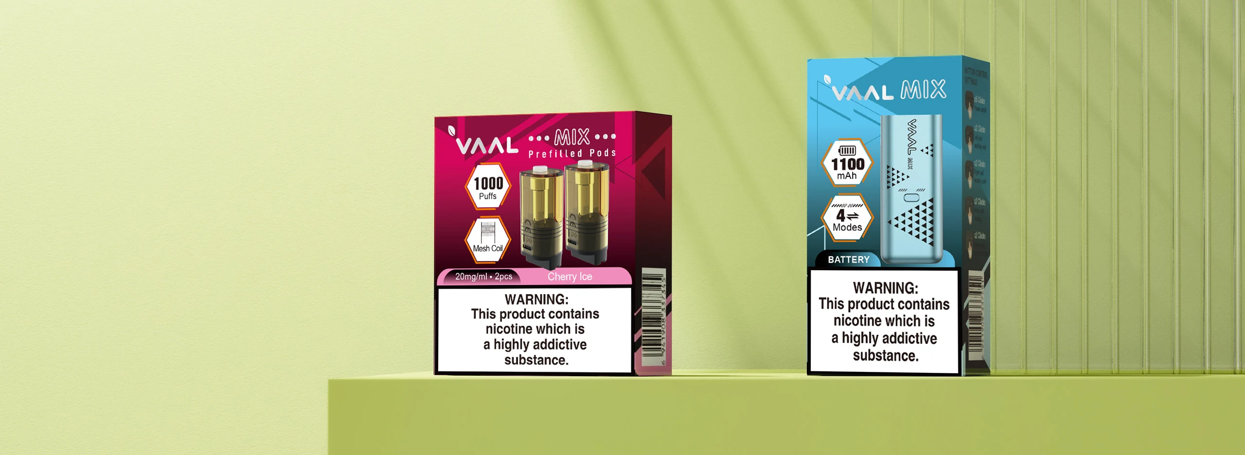 The VAAL MIX delivers up to 1000 puffs per pod with bold, satisfying flavor. Each 2ml prefilled pod contains 20mg nicotine and is equipped with a 1.2Ω mesh coil for smooth MTL performance. With dual pods and four vaping modes, you can freely mix or match flavors to suit your preference. Powered by a 1100mAh rechargeable battery and featuring Type-C charging, the VAAL MIX offers a customizable and long-lasting vaping experience.